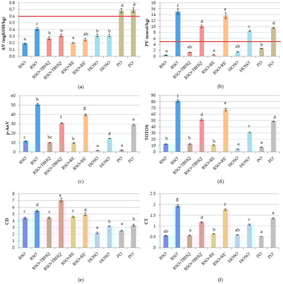 Oxidative stability parameters of oils before and after frying: (a) acid value (AV), (b) peroxide value (PV), (c) anisidine value (p-AnV), (d) TOTOX value, (e) conjugated dienes (CDs), and (f) conjugated trienes (CTs) content. Different lower-case letters indicate significantly different values (p < 0.05), while (a,b) include Codex Alimentarius threshold markers (red lines).