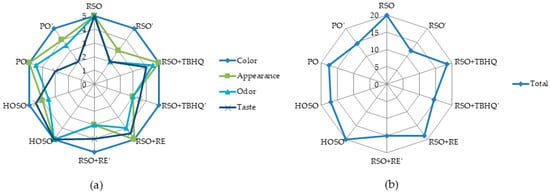 Sensory attributes of the blended vegetable oils (a) and total sensory score (b).