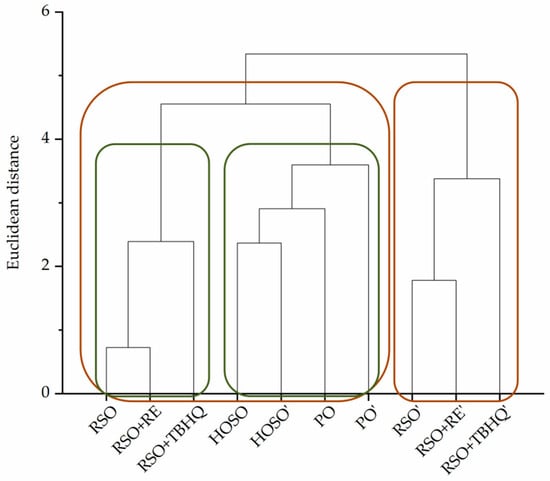 Hierarchical cluster analysis (HCA), shown in Figure 3, clearly confirmed the results of chemical, oxidative, and sensory analyses, highlighting the superiority of HOSO and PO compared to the other oils. These samples clustered together, with no significant changes observed after frying, confirming their high resistance to thermal degradation. Their stability primarily results from a favorable fatty acid composition, HOSO is dominated by oleic acid (over 80%), while PO naturally contains moderate amounts of saturated and monounsaturated fatty acids, contributing to its oxidative resistance. The obtained induction periods further support this resistance, with HOSO showing 26.2 h (100 °C) and 6.6 h (120 °C), and PO showing 27.0 h (100 °C) and 6.8 h (120 °C), the highest values among all analyzed samples.