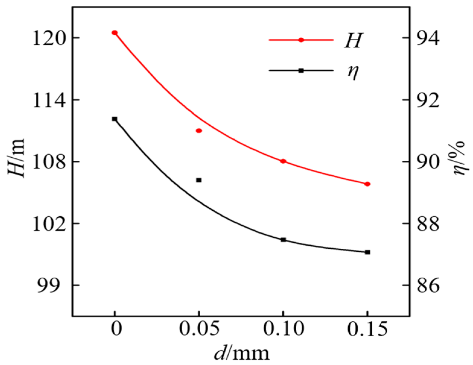 Table 5, when evaluating the head index, the three most significant influencing factors are the number of blades, outlet setting angle, and wrap angle, with corresponding weights (W) of 34.8%, 27.2%, and 19.3%, respectively. When evaluating the efficiency index, the three most significant influencing factors are the number of blades, inlet setting angle, and outlet diameter, with corresponding weights of 39.6%, 24.7%, and 16.8%, respectively. When considering the wear rate index, the three most significant influencing factors are the outlet angle and the inlet angle, and their corresponding weights are 69.7%, 15.6%, and 5.8%, respectively.