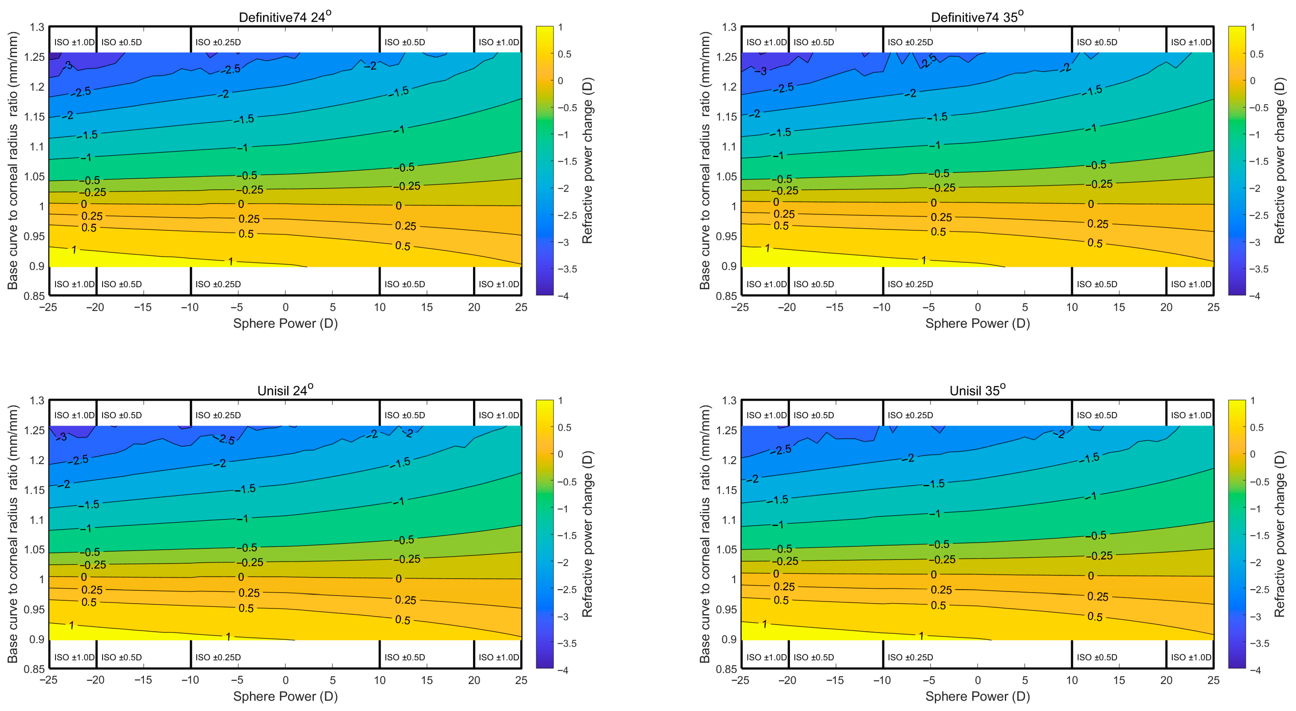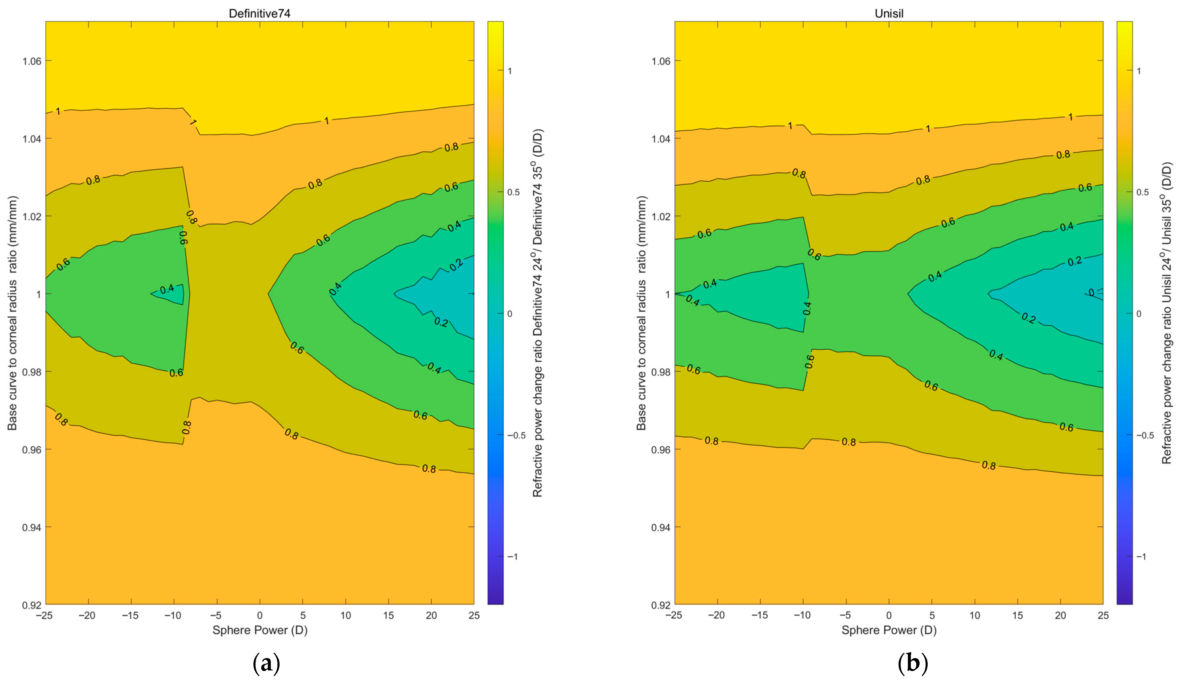 Comparing the temperature effect showed that the refractive power change in the temperature of 35 °C is less than that of 24 °C in both materials; however, Definitive 74 showed more steady behaviour among the spherical power range −10 D to 0 D with ratios closer to one.