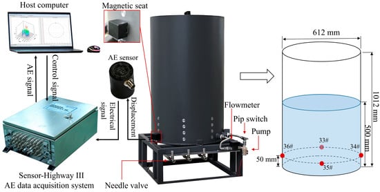 As shown in Figure 1, the AE inspection platform for oil tank bottom corrosion mainly consisted of an oil tank and an AE inspection system. The oil tank was made from Q235 steel, which is widely used in the petrochemical industry. The diameter, height and wall thickness of the oil tank were 612, 1012, and 6 mm, respectively. It was equipped with a speed-adjustable and corrosion-resistant circulating pump to create mechanical vibration and fluid disturbance. Three needle valves were installed at the tank bottom to simulate oil leakage. To ensure good contact between the AE sensors and outer wall of the oil tank, the AE sensors were mounted on the polished surface on the outside of the oil tank wall at heights of 5, 10, 15, and 20 cm from the bottom.