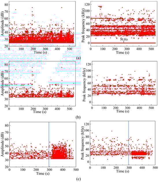 When the corrosive liquid in the oil tank completely stood still, a 25 dB initial threshold was employed to test the background noise. A scatter diagram of the AE signal amplitude and peak frequency is shown in Figure 2a. The majority of AE signal amplitudes were concentrated between 25 and 50 dB, particularly at lower amplitudes. Additionally, the 50 Hz peak frequency formed a nearly straight line, which is far beyond the range of normal corrosion signals. When external noise was excluded, it was inferred that electromagnetic interference occurred within the AE instrument.