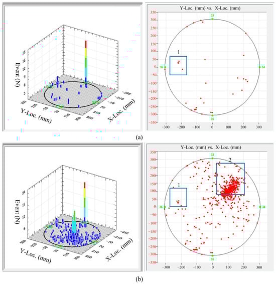 Figure 3 presents the AE signal localization at the oil tank bottom with and without friction noise. When friction was not applied, AE events were intense in the squared area (see Figure 3a), indicating active corrosion in this region. When the oil tank wall was rubbed by sandpaper, another larger area of intense AE events formed (see Figure 3b), identified as corrosion events in AE inspection. Therefore, false identification of oil tank bottom corrosion necessitates distinguishing different types of noise interference in AE inspection of oil tanks.