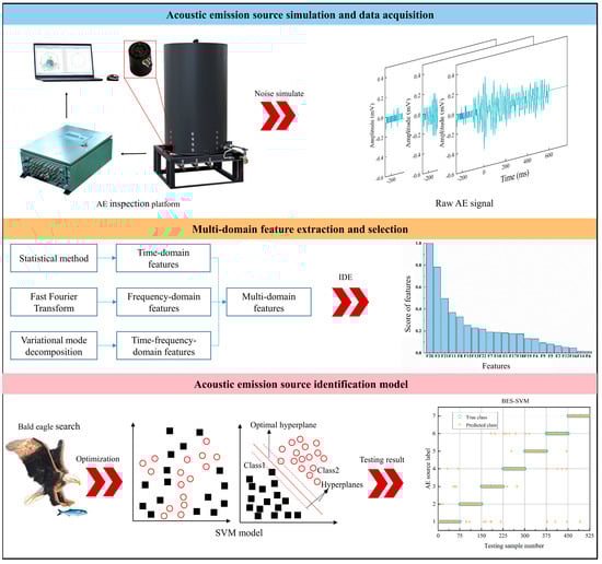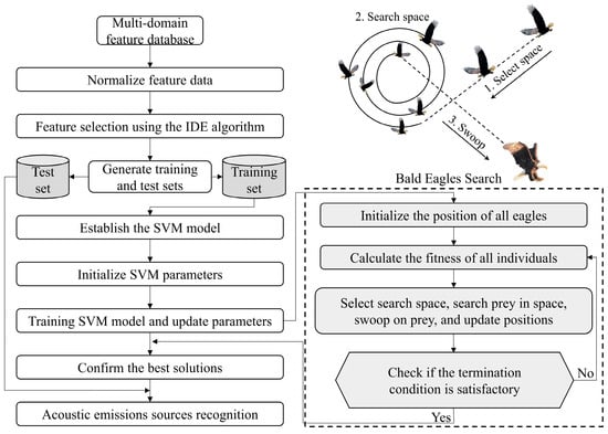 To improve the accuracy of AE source identification, a novel method based on multi-domain features and BES-SVM algorithm is proposed. Figure 5 presents a flowchart of the noise identification method.