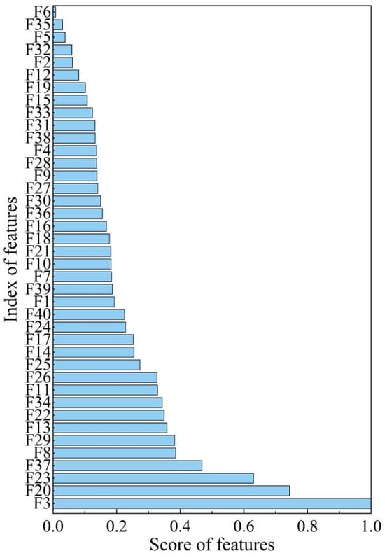 IDE was introduced to evaluate the relevance of features to AE sources. Scores of the multi-domain features are shown in Figure 6, where a higher score indicates that it contained more important information regarding the AE source. In this work, the top 20 features were selected as inputs for the BES-SVM model. Among them, the mean, frequency mean, energy of IMF3, dispersion entropy of IMF7, and Kurtosis ranked the top five features.