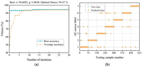 The variation of model fitness with respect to the iteration number is presented in Figure 7a, where fitness is defined as the average accuracy obtained from 5-fold cross validation. It can be seen that the optimal solution was obtained early in the iteration process. The optimal penalty factor and the kernel function parameter were 56.6692 and 1.0658, respectively, and the 5-fold cross validation accuracy was 94.47%. The corresponding AE source identification results are shown in Figure 7b. The proposed method based on multi-domain features and the BES-SVM model demonstrated a superior ability to identify AE sources. The identification accuracy, precision, recall, and F1 on the test set reached up to 93.71%, 93.80%, 93.71%, and 93.74%, respectively.