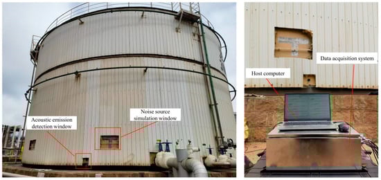 Oil tanks are among the most essential equipment in the petroleum industry for oil storage. Oil tanks inevitably experience corrosion during long-term use. As stored oils are generally flammable, explosive, and toxic, once corrosion perforation leakage occurs, the consequence is usually disastrous [,]. Compared with oil tank walls and roofs, the bottoms are more likely to corrode and are more difficult to inspect []. Conventional nondestructive testing (NDT) technologies, such as ultrasonic testing, magnetic flux leakage, and magnetic particle inspection, require various procedures, including production suspension, gas replacement, and tank cleaning, wherein the last step is corrosion inspection. The complex inspection procedures make these approaches laborious, time-consuming, and highly expensive []. AE inspection is an emerging passive NDT technique that dynamically monitors the generation, development, and evolution of material damage without production shutdown, which saves significant time and inspection costs [,]. Defects such as corrosion, stress cracking, and friction create rapid energy release from the source and generate vibrations. The vibrations propagate to the surface in the form of stress waves, resulting in surface displacement, which can be detected by highly sensitive AE sensors and converted into electrical signals for further analysis []. Currently, assessment of the area and degree of corrosion is mainly based on the density distribution of AE events [], which can easily be produced by noises such as mechanical vibrations and fluid disturbances during AE inspection. These noises are easily mistaken for corrosion events and affect the inspection results. Therefore, limiting the interference of noise signals in corrosion evaluation is a critical challenge for AE inspections of oil tank bottom corrosion.