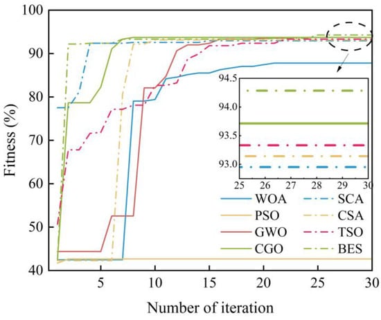 To demonstrate the performance of the BES-SVM model in AE source identification, seven different types of swarm intelligence algorithms were employed to optimize the penalty factor and kernel function parameter of SVM, including the whale optimization algorithm (WOA), particle swarm optimization (PSO), grey wolf optimization (GWO), the chaos game algorithm (CGA), the sine cosine algorithm (SCA), transient search optimization (TSO), and the cuckoo search algorithm (CSA). The population and iteration numbers were set to 10 and 30, respectively. The variation trend of fitness in the first training of each model is given in Figure 10. Compared with other models, WOA-SVM and PSO-SVM are more likely to fall into local optimal solutions. Their 5-fold cross-validation accuracy rates were 87.81% and 42.67%, respectively. The BES-SVM model achieved the highest fitness of 94.29%, with fast convergence speed in the early stages, indicating a strong global and local searching capability. Meanwhile, the BES-SVM model reached the optimal solution most of the time, with a standard deviation of testing accuracy of 0.25%, proving its strong robustness and stability.