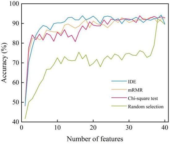 The performance of IDE was compared with some mainstream feature selection algorithms, including minimum-redundancy maximum-correlation (mRMR) and chi-square detection. Additionally, features were also randomly selected as inputs to the BES-SVM model. Figure 11 shows the recognition accuracy versus feature number curve using different feature selection algorithms. Recognition accuracy using random selection clearly ranked the worst. When the feature number was less than 20, the performance of the IDE algorithm was better than mRMR and the chi-square test. Subsequently, the identification accuracy of these three algorithms leveled off with little difference, indicating that the subsequent features contributed minimally to AE source identification. Since increasing the feature number requires more computation time, feature selection must carefully balance identification accuracy and computation time. In this work, the IDE algorithm was selected to reduce feature dimensions.