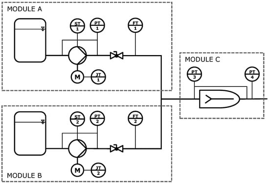 A simplified plant consisting of two parallel dosing modules (A and B) that feed one mixing module (C). Measurement equipment for the electric motor power (JT), pump speed (ST), differential pressure (PT) and volume flow (FT) is installed for monitoring and validation purposes.