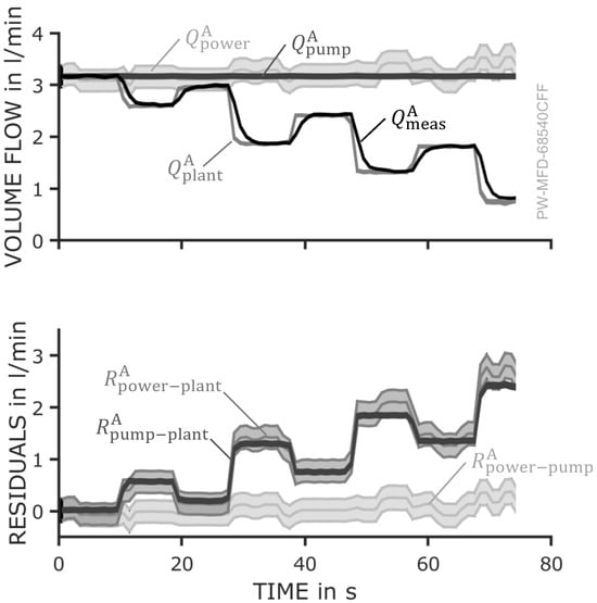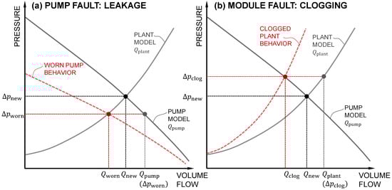 Another fault is depicted on the right side of Figure 3. If the module is clogging, the pressure loss increases for a given volume flow. This shifts the operating point to a higher pressure and a lower volume flow . The pump observer, using the increased pressure difference, correctly estimates the volume flow as . However, the plant observer—still assuming normal module conditions—overestimates the flow as . This results in a negative residual .