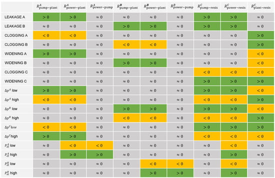 Fault-symptom matrix for the examined faults in the simplified plant: The different faults (rows) result in values of the different residuals (columns) that are either positive, negative, or approximately zero. All lines are unique, meaning that there is a unique residual signature for every fault.