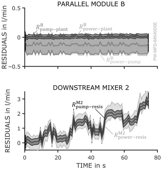 The behavior of all residuals aligns with the expectations in Figure 4. The first row of the table indicates the different residuals for the fault “internal leakage” in module A. The residuals of the affected module and should exhibit an upward trend, while the residual remains unchanged. Residuals for the parallel module are expected to remain unaffected altogether. For the downstream module, residuals and increase, while residual remains unaffected.