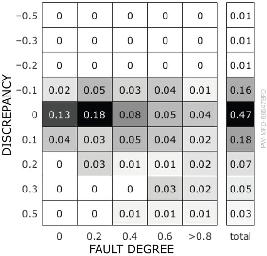 Figure 11 presents the results of a comprehensive experimental evaluation involving single-fault scenarios across all modules of the modular mixing plant. The various fault types, as described in Section 3.2, were systematically introduced at over 1200 distinct stationary operating points. The discrepancy describes the difference between the diagnosis output and the actual fault degree. Each entry in Figure 11 indicates the frequency of occurrence for a given level of discrepancy at a specific fault degree.