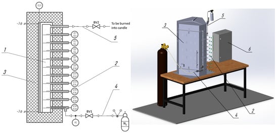 Figure 1 shows the schematic diagram and 3D model of the experimental setup designed to study the exothermic processes of thermochemical biomass conversion (pyrolysis and dry torrefaction). The aim of the research is to obtain the temperature profile at various points within the fixed bed of biomass.