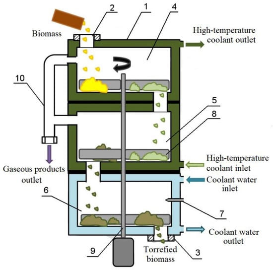 Schematic diagram of the reactor for dry biomass torrefaction. 1—Torrefaction reactor body, 2—feed unit for raw biomass, 3—discharge unit for torrefied biomass, 4, 5—torrefaction trays, 6—cooling tray for torrefied biomass, 7—nozzle for cooling water supply, 8—stirrer, 9—stirrer shaft with electric drive, 10—pipeline for the removal of gaseous torrefaction products.