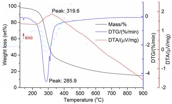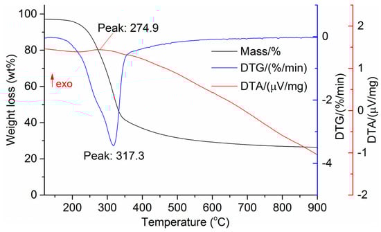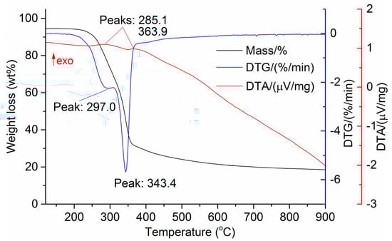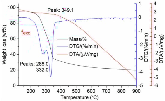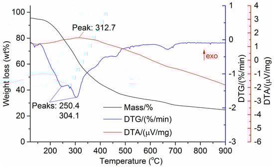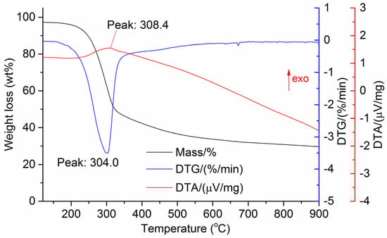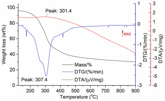 Differential thermogravimetry (DTG), and differential scanning calorimetry (DSC), were determined using a thermal analyzer (SDTQ 600, TA Instruments, New Castle, DE, USA). Thermograms were recorded in a mixture of argon, nitrogen, and oxygen. The heating rate was 5 °C/min.