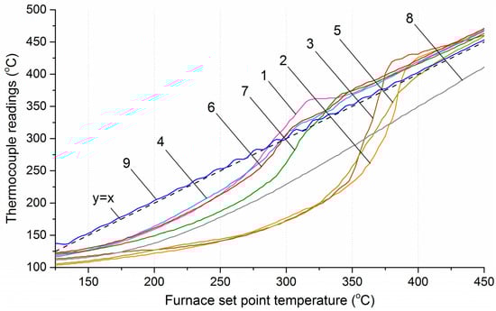 Temperature profiles along the reactor axis at section № 4. 1—sunflower husks, 2—corn stalks and cobs, 3—wheat straw, 4—coffee skin, 5—olive leaves, 6—sugarcane bagasse, 7—date palm leaves, 8—charcoal, 9—furnace temperature.