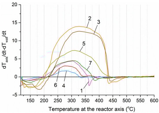 where dTaxis/dt—the first derivative of the temperature along the reactor axis with respect to time, dTw/dt—the first derivative of the temperature at the reactor wall with respect to time. The first derivative represents the rate of temperature change over time. The change in temperature of charcoal in the absence of chemical or phase reactions approximately corresponds to the change in temperature of the heating elements of the furnace, which is set using PI control (Figure 10). However, the rate of temperature change in the sample is directly proportional to the energy of the exothermic and endothermic reactions occurring during thermal decomposition of the biomass. A positive difference between the rates of temperature change along the reactor axis and at the reactor wall indicates the presence of heat-releasing processes within the material layer. The dependence of this difference on the temperature along the reactor axis at section № 4 is shown in Figure 11.