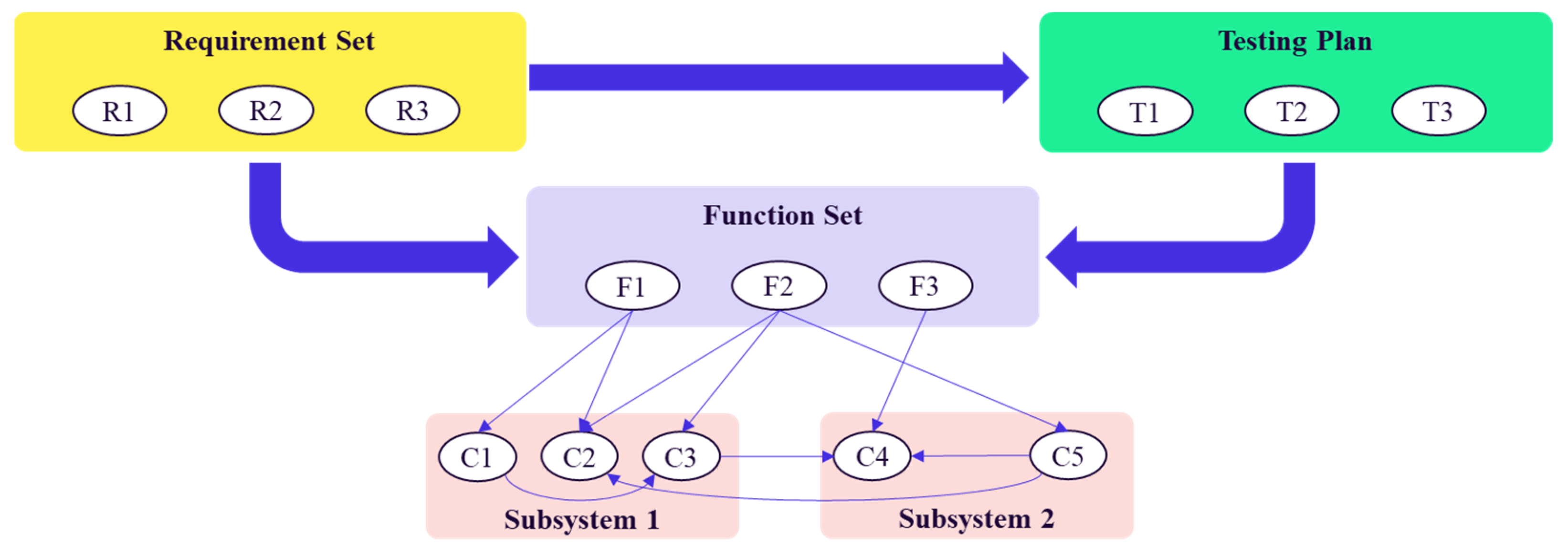 - Subsystems & Components: Each function in the Function Set relies on multiple software components distributed across Subsystem 1 and Subsystem 2. For instance, F1 may depend on C1 and C2 from Subsystem 1, while F2 may share C2 with F1 and additionally utilize C3 from Subsystem 2.