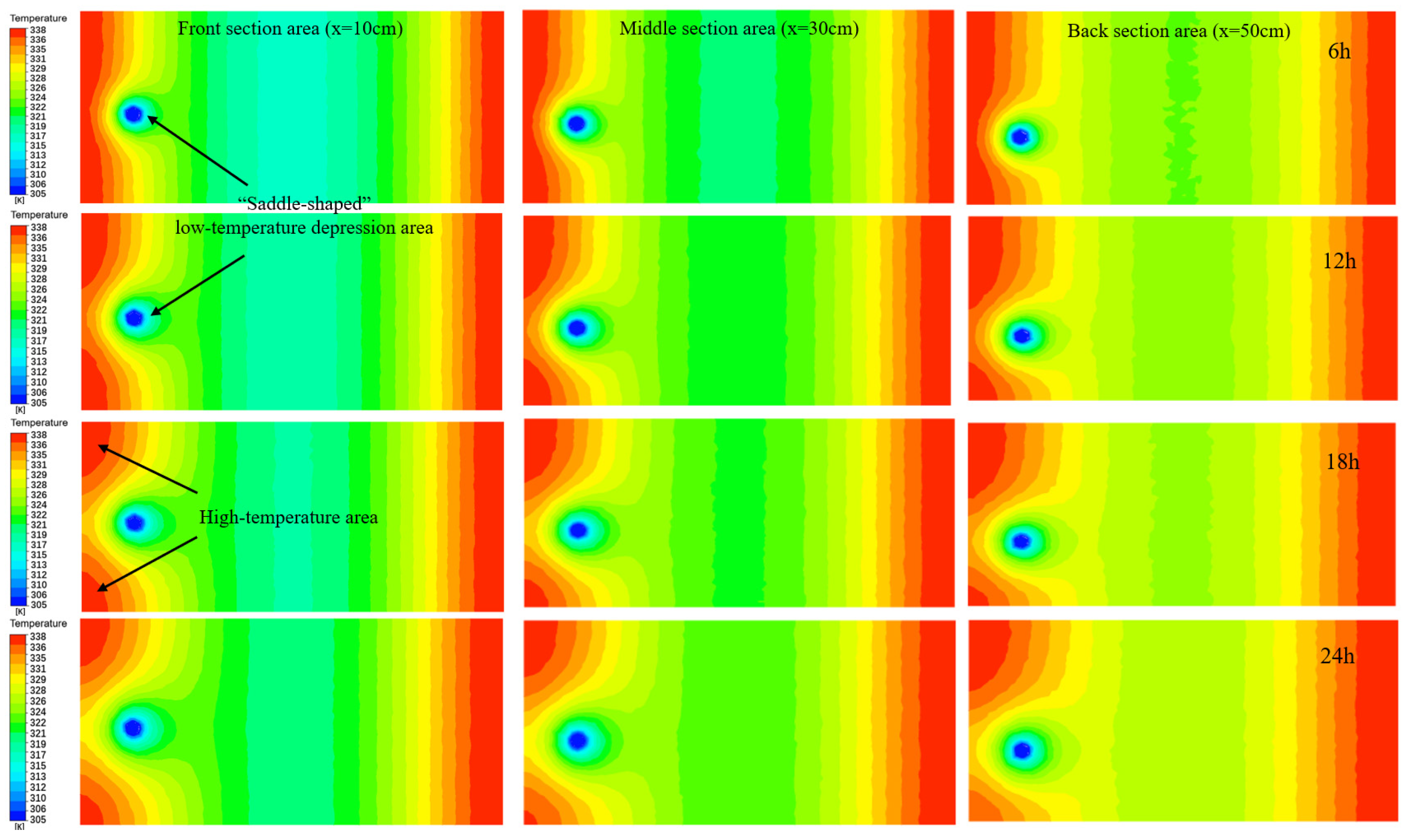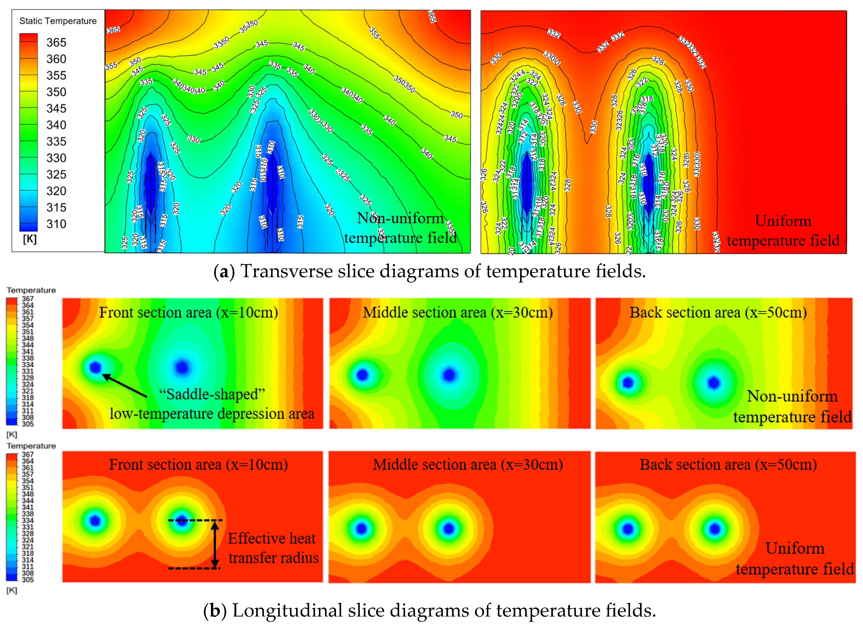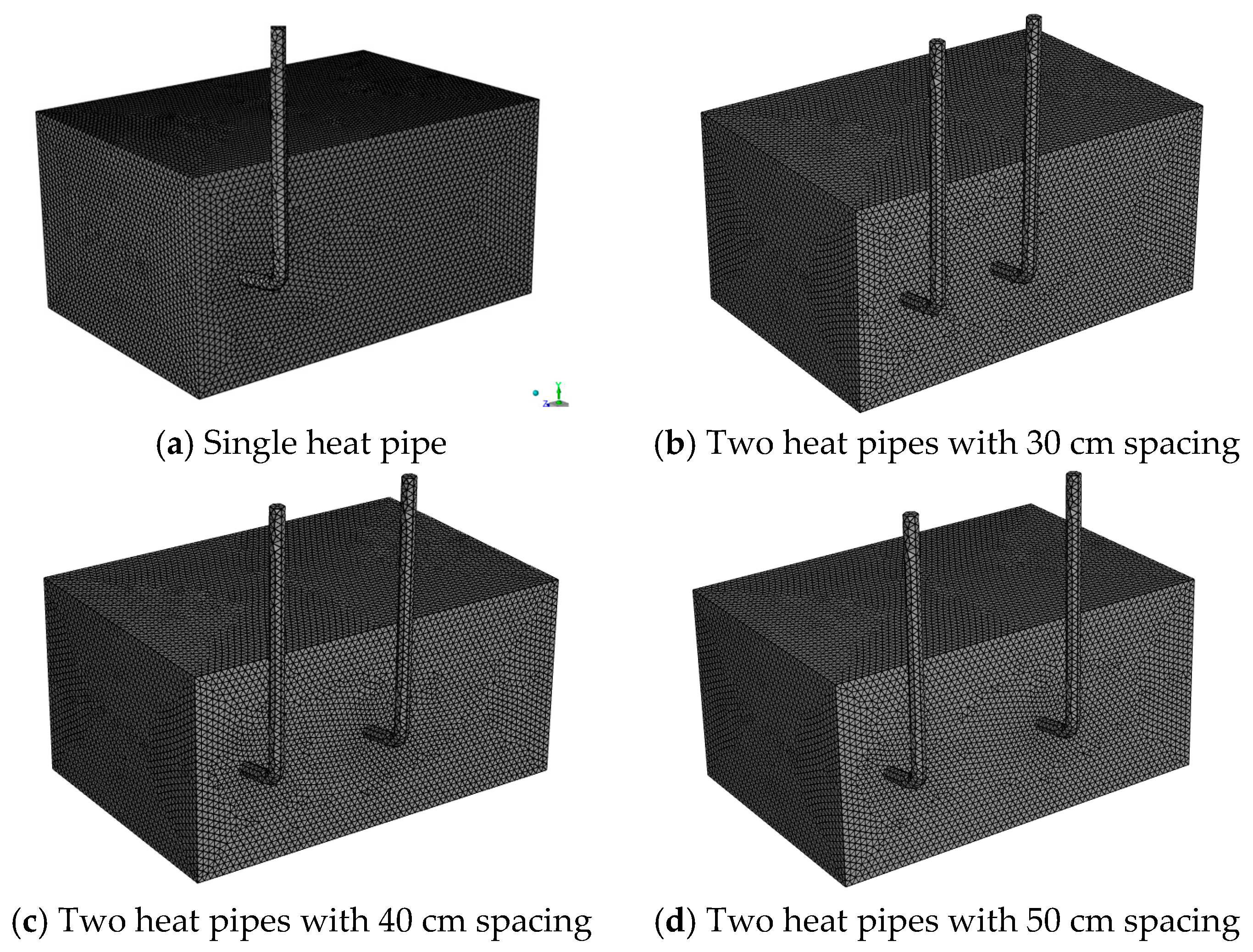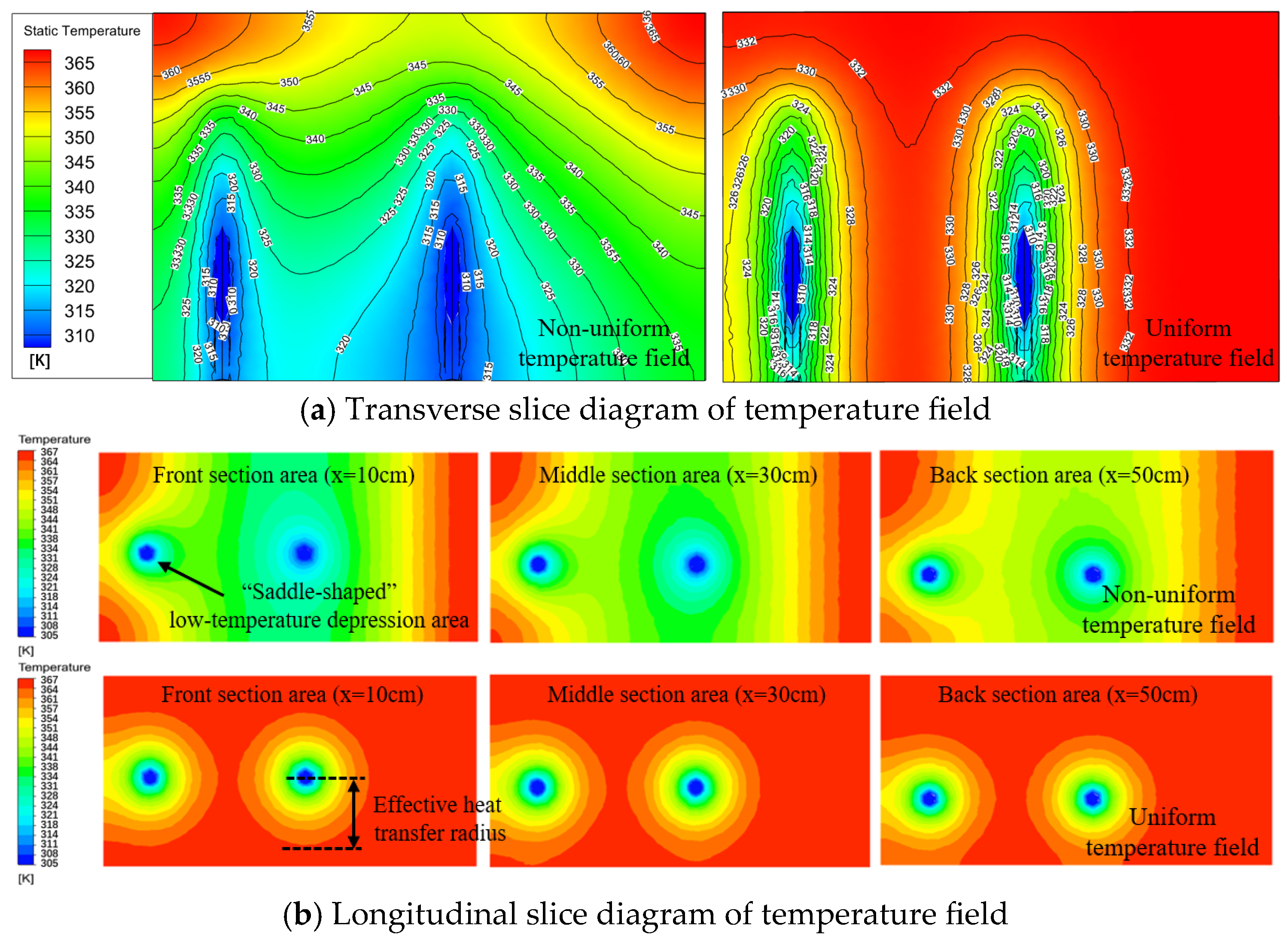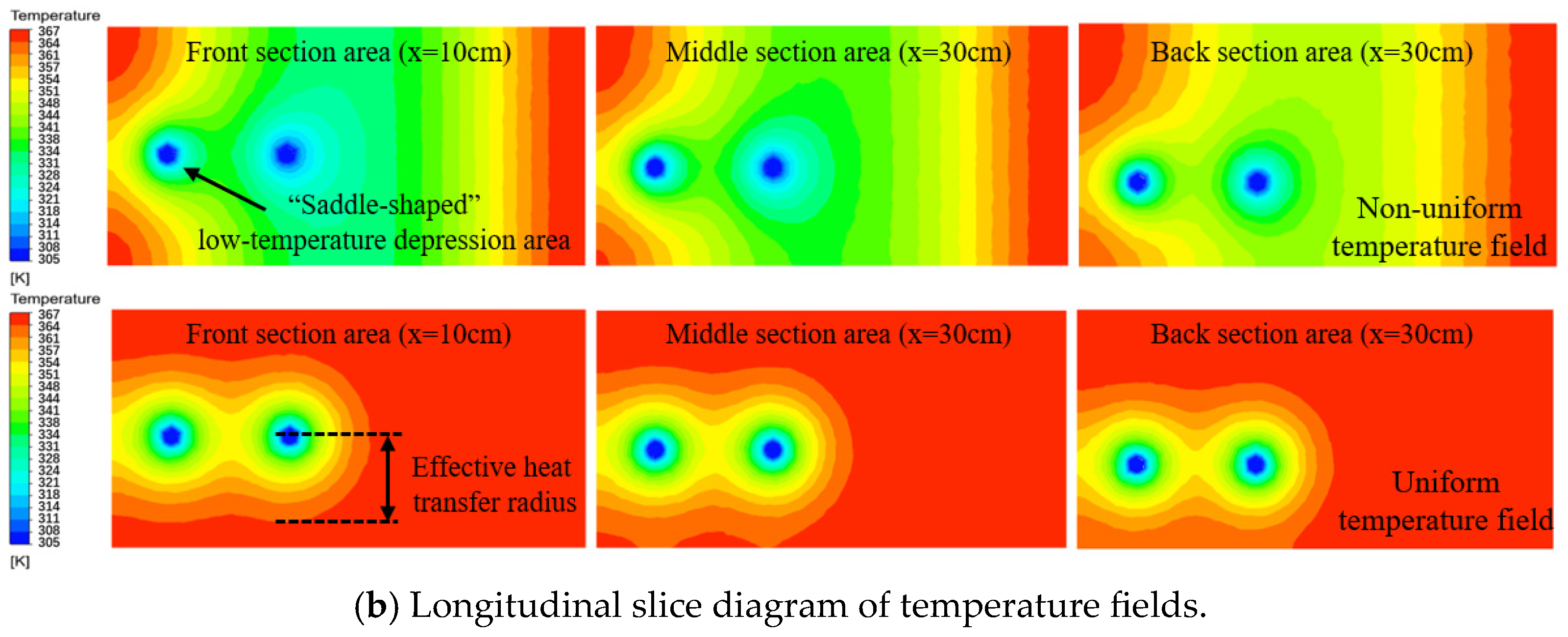 - The heat transfer effects induced by the three different spacings between bending heat pipes under two temperature field conditions were compared. The best heat transfer effect can be achieved at a spacing of 30 cm, with an efficiency of 36.7%. At a spacing of 50 cm, the temperature suppression effect was reduced because of the limited heat transfer radius of the bent heat pipe. Overall, 30–40 cm is the best spacing between bending heat pipes, achieving both a heat transfer effect and cost-effectiveness. A similar-ratio design based on this optimal spacing can be applied directly to a mining site, which can effectively decrease costs while ensuring heat transfer.