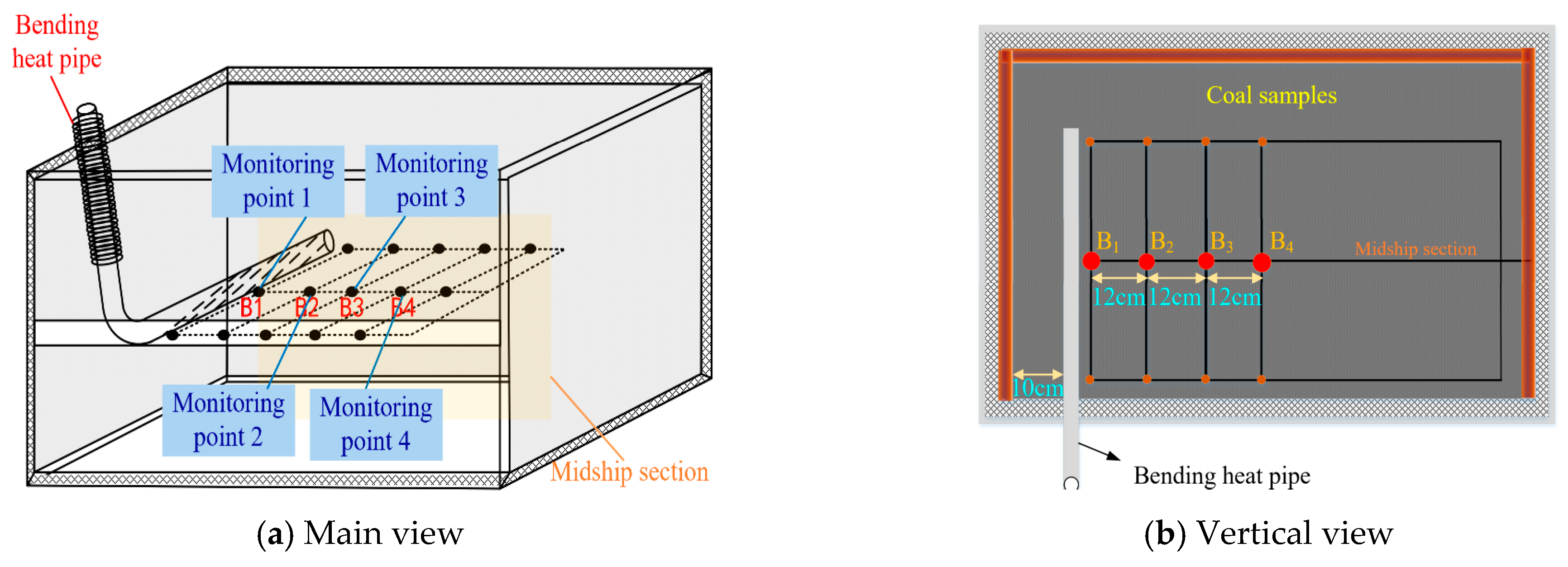 - Our research results provide a theoretical reference for the use of bending heat pipes to inhibit the spontaneous combustion of coal pillars, which to a certain extent can lead to early prevention and control of the oxidation of heat sources in the broken area of coal pillars. Due to the length of our experimental period, the experimental conditions have certain objective limitations. In the future, this experiment can be optimized by prolonging the monitoring time and increasing the density of temperature monitoring points. In order to effectively prevent and control spontaneous combustion of coal pillars under actual mining conditions, the synergistic effect of multiple bending heat pipes, the phase change law of the working medium inside the heat pipes, and the field conditions should be studied in depth.