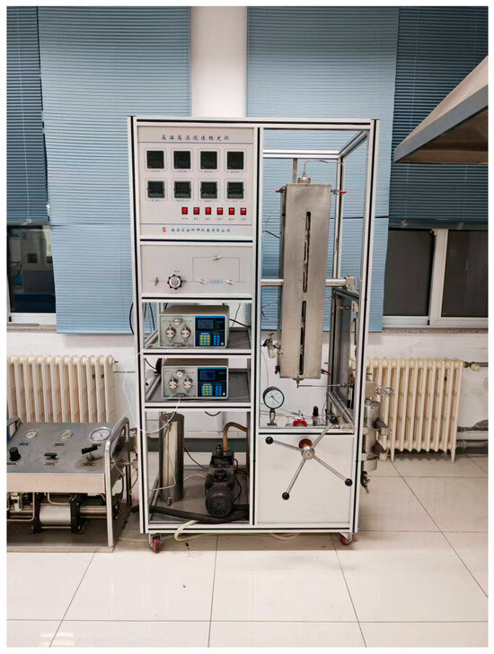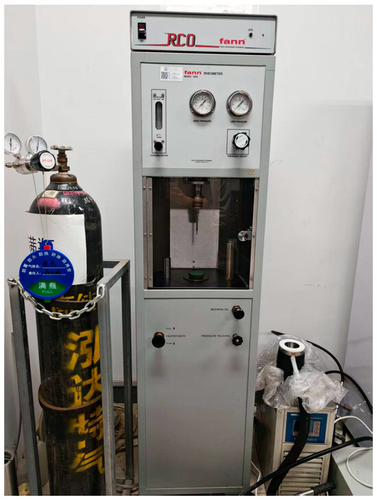 As shown in Figure 3, the high-temperature and high-pressure rheometer (Model Fann 50SL), manufactured by Fann Instrument Company (Houston, TX, USA), is primarily used to determine the viscosity, shear stress, and other parameters of drilling fluids under high-temperature and high-pressure conditions at various shear rates. The operating pressure is ≤30 MPa, and the operating temperature is ≤260 °C.