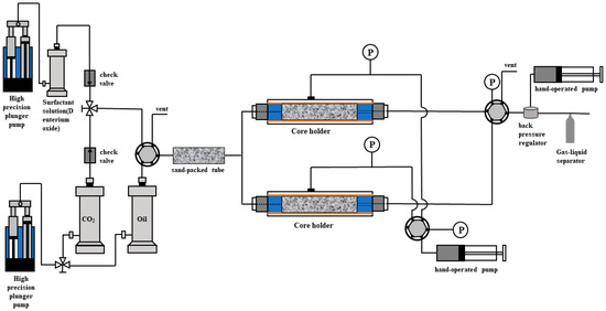 In this study, a parallel-core displacement apparatus, as shown in Figure 4, was employed. The apparatus consists of injection, displacement, and production systems. The injection system utilizes two high-precision plunger pumps to independently control the injection flow rates of CO2 and surfactant solution. The intermediate containers are filled with surfactant solution and CO2, respectively, which are connected through a sand-packed tube foam generator to the parallel-core holders. The displacement system is composed of two core holders, where confining pressure is applied via a hand-operated pump to simulate overburden pressure. In the production system, a back-pressure valve is used to simulate bottomhole pressure, while graduated cylinders and a gas meter are employed for real-time measurement of oil and gas production. Two pressure transducers are installed at both the inlet and outlet of the core holders, and the recorded pressures are subsequently used to calculate foam blocking efficiency.