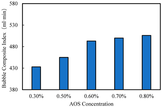 To select a primary foaming agent concentration that is both effective and cost-efficient, five concentrations (0.3%, 0.5%, 0.6%, 0.7%, and 0.8%) were tested. The comprehensive foam index calculated for each concentration was used to construct the bar and line trend plots of foaming performance for AOS at different concentrations, as shown in Figure 6.