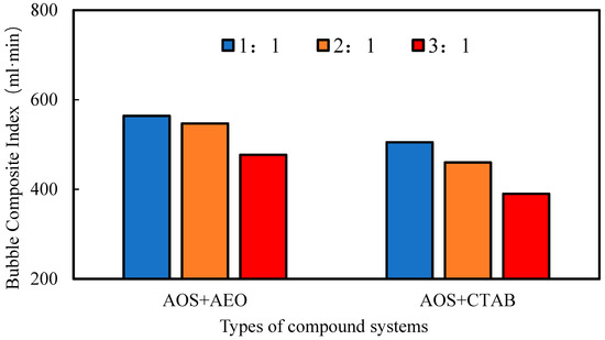 To select an optimal compound foaming system, 0.6 wt% AOS was used as the primary surfactant, with AEO and CTAB as secondary surfactants for formulation. The optimization of the compound system was conducted by varying the type and mass ratio of the secondary surfactants, combined with performance evaluation tests. The comparison of foaming performance for the two compound systems using AEO or CTAB as the secondary surfactant at different mass ratios is shown in Figure 7.
