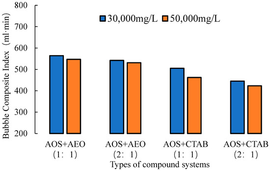 As shown in the figure, the AOS+AEO compound system exhibits superior salt tolerance compared with the AOS+CTAB system across different mass ratios. When the salinity increases from 30,000 mg/L to 50,000 mg/L, the foaming performance of the AOS+AEO system at both mass ratios retains 97% and 98% of the original level, whereas the AOS+CTAB system retains only 91.5% and 95.1%, respectively. This indicates that the foaming performance of the AOS+AEO system is less affected by increasing salinity and demonstrates better salt resistance.