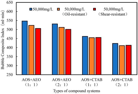 As shown in the figure, the AOS+AEO compound system at a 2:1 mass ratio exhibits excellent oil tolerance and shear resistance. Its foaming performance shows no significant decline after the addition of crude oil and shear treatment. Although slightly lower than that of the 1:1 AOS+AEO system, the difference is minimal. The AOS+CTAB system demonstrates even less reduction in foaming performance under oil addition and shear, indicating better oil tolerance and shear resistance; however, its overall foam index is substantially lower than that of the AOS+AEO system.