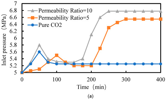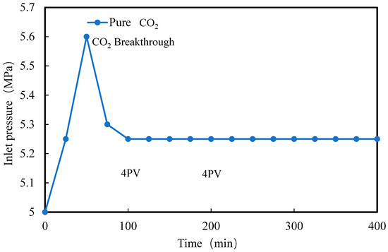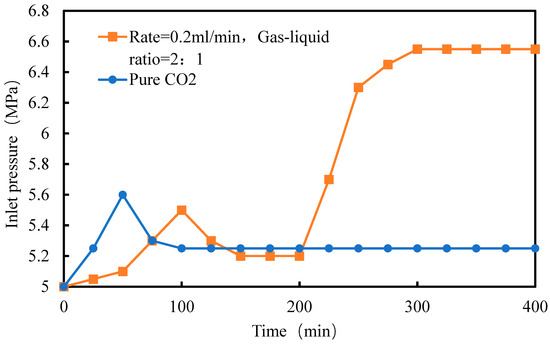 For the first group (permeability ratio = 5, injection rate = 0.2 mL/min), a heterogeneous reservoir was subjected to pure CO2 flooding as the control. The variation in inlet pressure with time is shown in Figure 10. The injected PV count was calculated starting from CO2 breakthrough. After injecting 4 PV of CO2, the system stabilized, followed by an additional 4 PV injection. At this point, the inlet pressure reached 5.24 MPa, and the difference from the outlet back pressure of 5 MPa, MPa, was used to calculate the blocking efficiency for the subsequent CO2 foam flooding experiments.