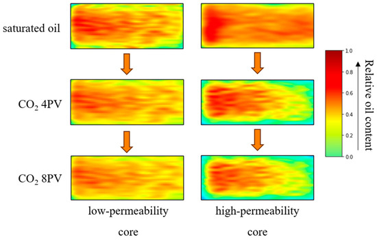 NMR images of high- and low-permeability cores in the control group after pure CO2 flooding.