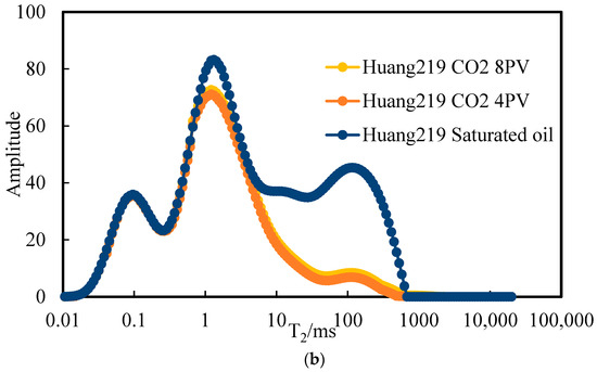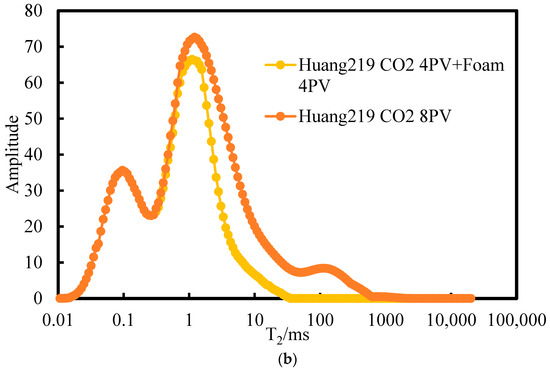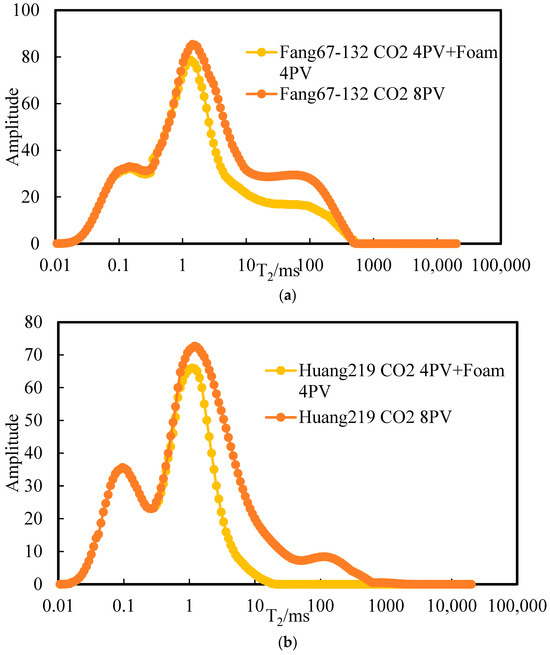 T2 spectra of low-permeability core (a) and high-permeability core (b) in the control group after pure CO2 flooding.