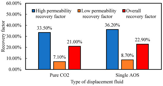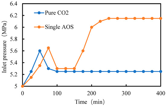 The comparative experiment between AOS+AEO foam flooding and pure CO2 flooding was conducted with the compound system at an AOS–AEO mass ratio of 2:1. The gas–liquid ratio of the system to CO2 was set at 2:1, the injection rate was 0.2 mL/min, and the permeability ratio between the high- and low-permeability cores was 5. The inlet pressure versus time curves are shown in Figure 17. It can be seen that foam flooding with the AOS+AEO system effectively blocks the high-permeability layer, achieving a blocking rate of 84.5% through calculation. This is superior to the 79.1% blocking rate of the single-system AOS. This indicates that the system significantly reduces CO2 channeling through high-permeability zones, allowing the displacing fluid to sweep a larger portion of the core and thereby providing the potential to further enhance oil recovery.