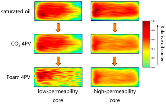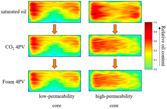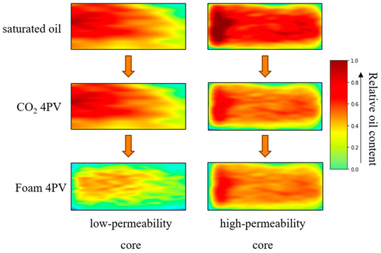 The nuclear magnetic resonance images of the AOS single system foam flooding before and after are shown in Figure 14. It can be seen from the figure that after 4PV pure CO2 flooding, the oil saturation of the low-permeability core remains basically unchanged. After the AOS single system foam flooding for 4PV, the oil utilization in the low-permeability core was enhanced, and the oil saturation decreased. Qualitative analysis indicates that the AOS single system foam flooding effectively blocks high-permeability channels and improves crude oil utilization of low-permeability cores.