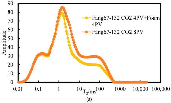 Comparison of T2 spectra for low-permeability core (a) and high-permeability core (b) between compound foam flooding and the control group.