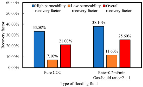 The T2 spectra of the two cores in the control group before and after flooding, along with the corresponding recovery calculated from peak areas, are shown in Figure 12 and Figure 16. It can be seen that after pure CO2 flooding, the peak area of the T2 spectrum for the high-permeability core decreases significantly, whereas the low-permeability core shows only a slight decrease. This indicates that most of the oil is produced from the high-permeability core, while oil mobilization in the low-permeability core is minimal. Furthermore, the oil produced from the high-permeability core mainly originates from the larger pores. After 8 PV of pure CO2 flooding, the overall recovery of the two cores is 21.0%, with 33.5% from the high-permeability core and only 7.1% from the low-permeability core. These results quantitatively confirm that the high-permeability core contributes the majority of oil production during pure CO2 flooding, while the low-permeability core retains substantial recovery potential.