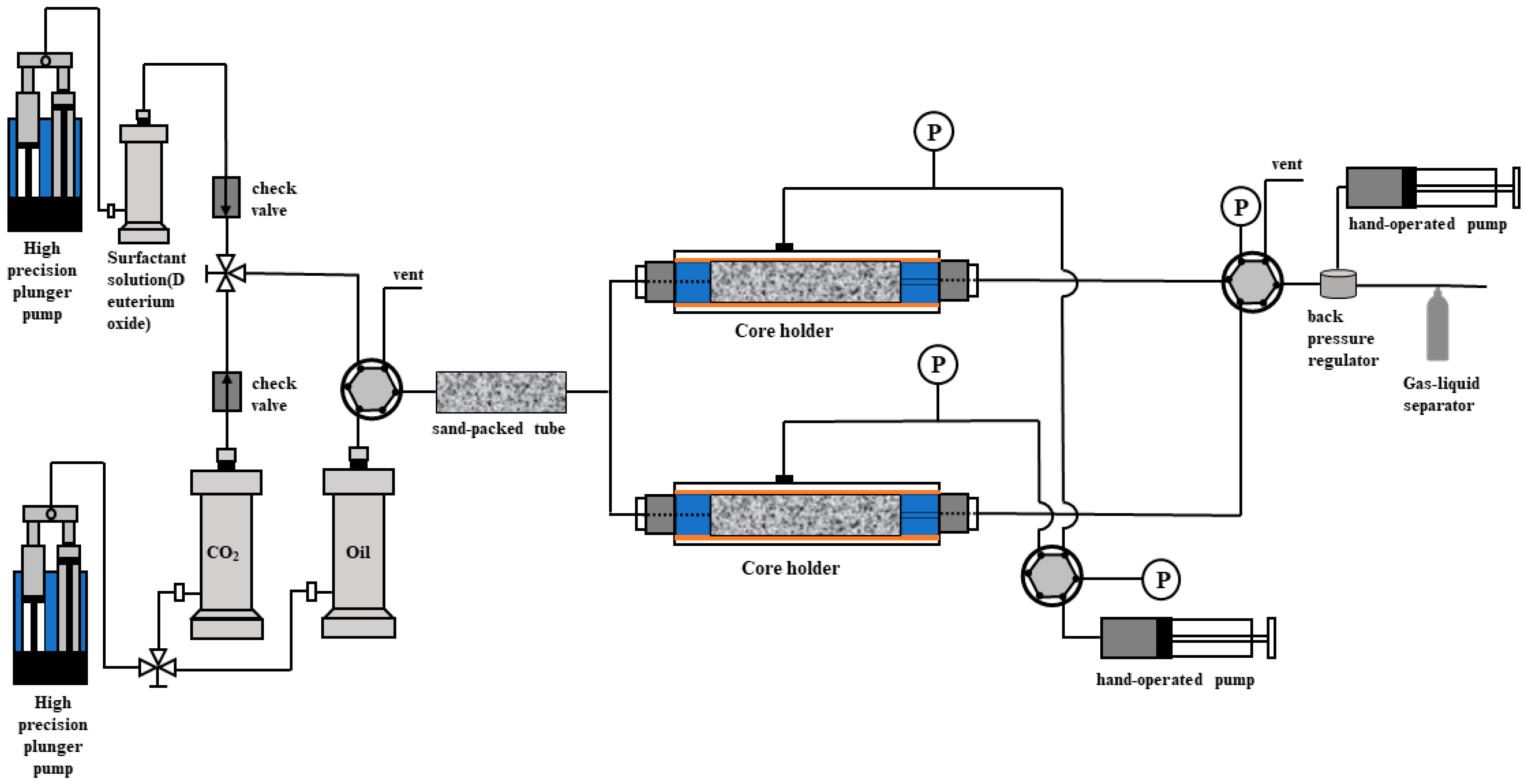 - Core preparation and setup: Place the two saturated cores into the parallel-core holder. After connecting all lines, apply a confining pressure of 10 MPa and set the back pressure to 5 MPa;
