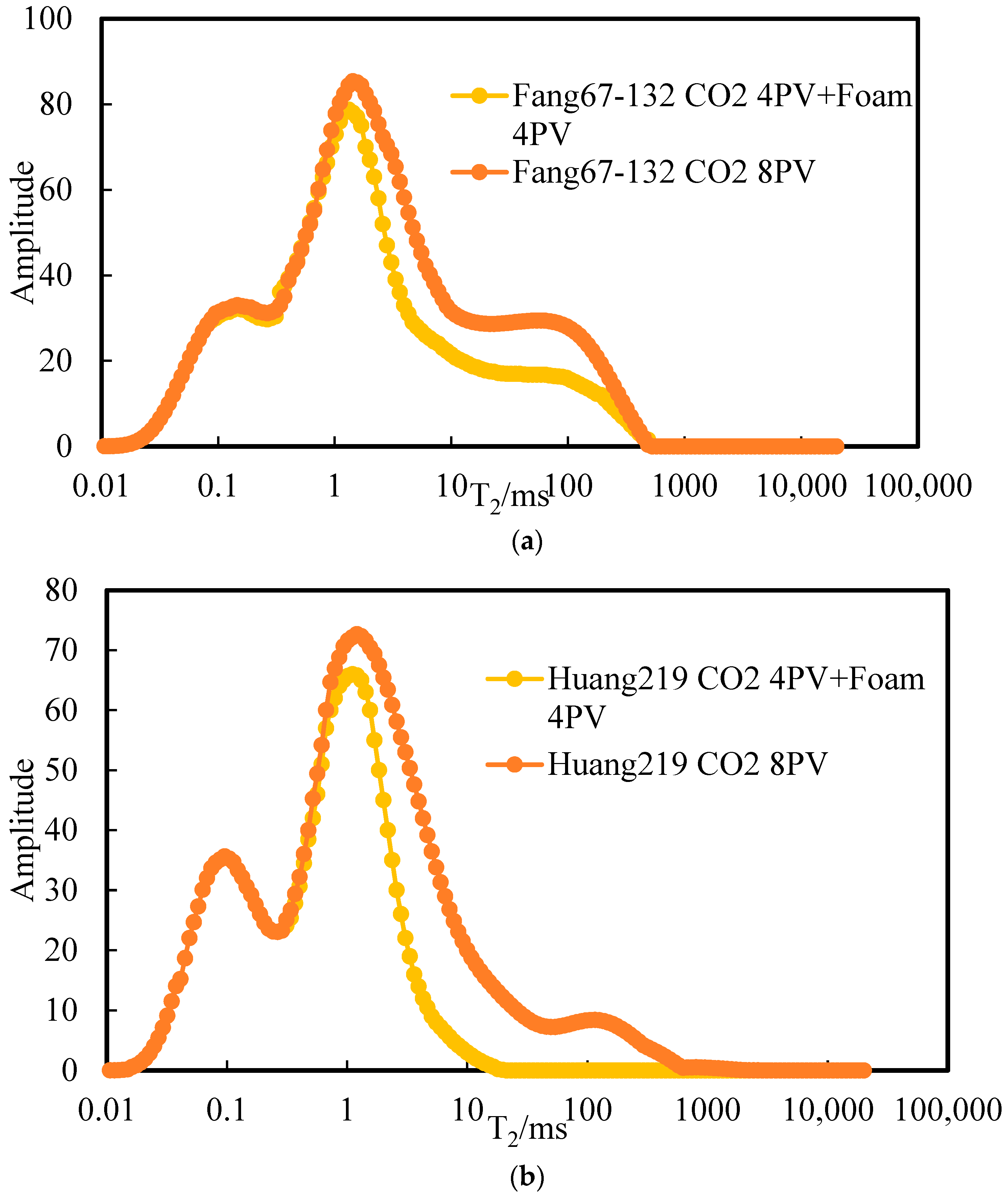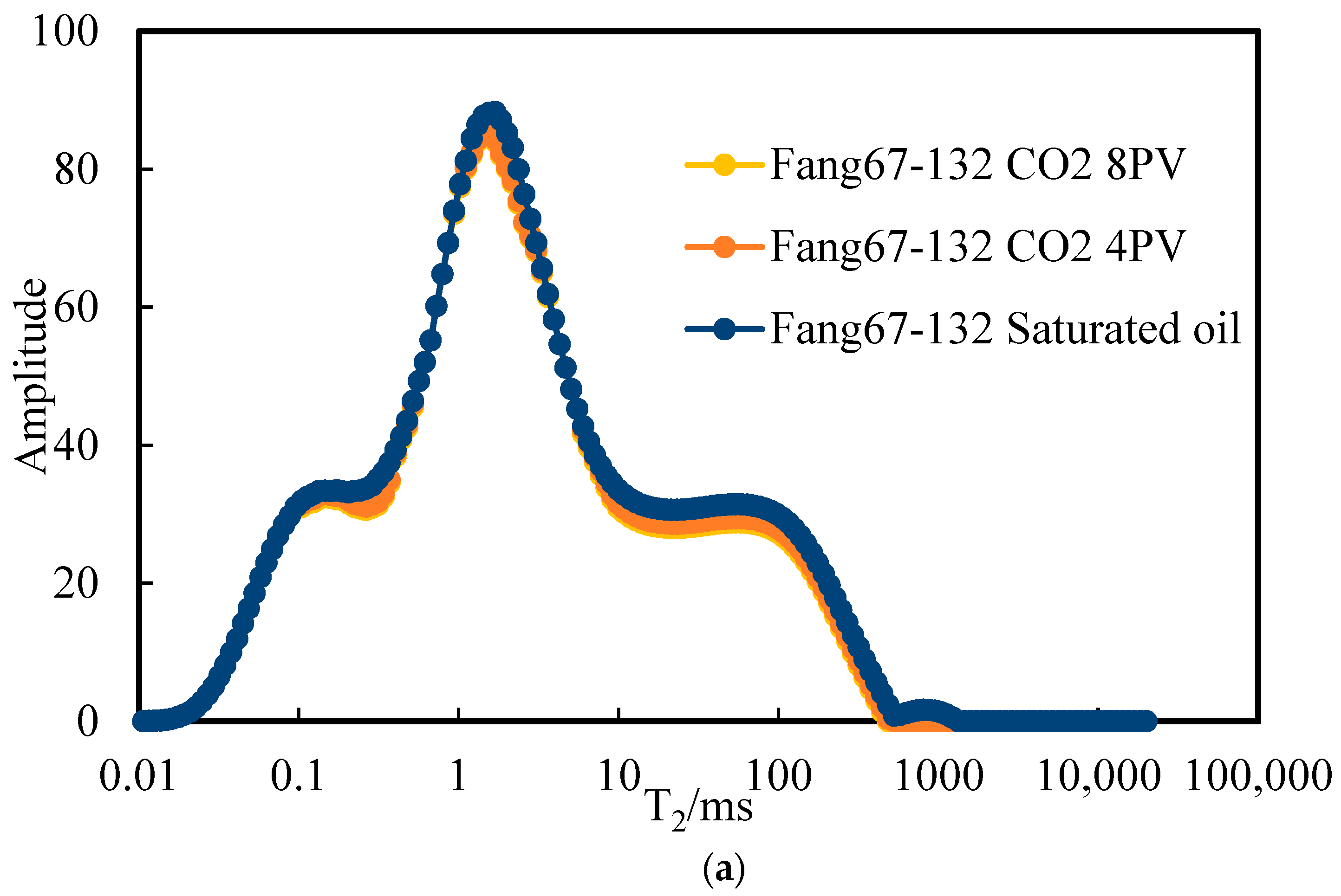 - Secondary CO2 flooding: After NMR measurement, place the cores back into the holder and repeat the flooding procedure for another 4 PV. After completion, record the inlet–outlet pressure differential and conduct NMR T2 measurement again;