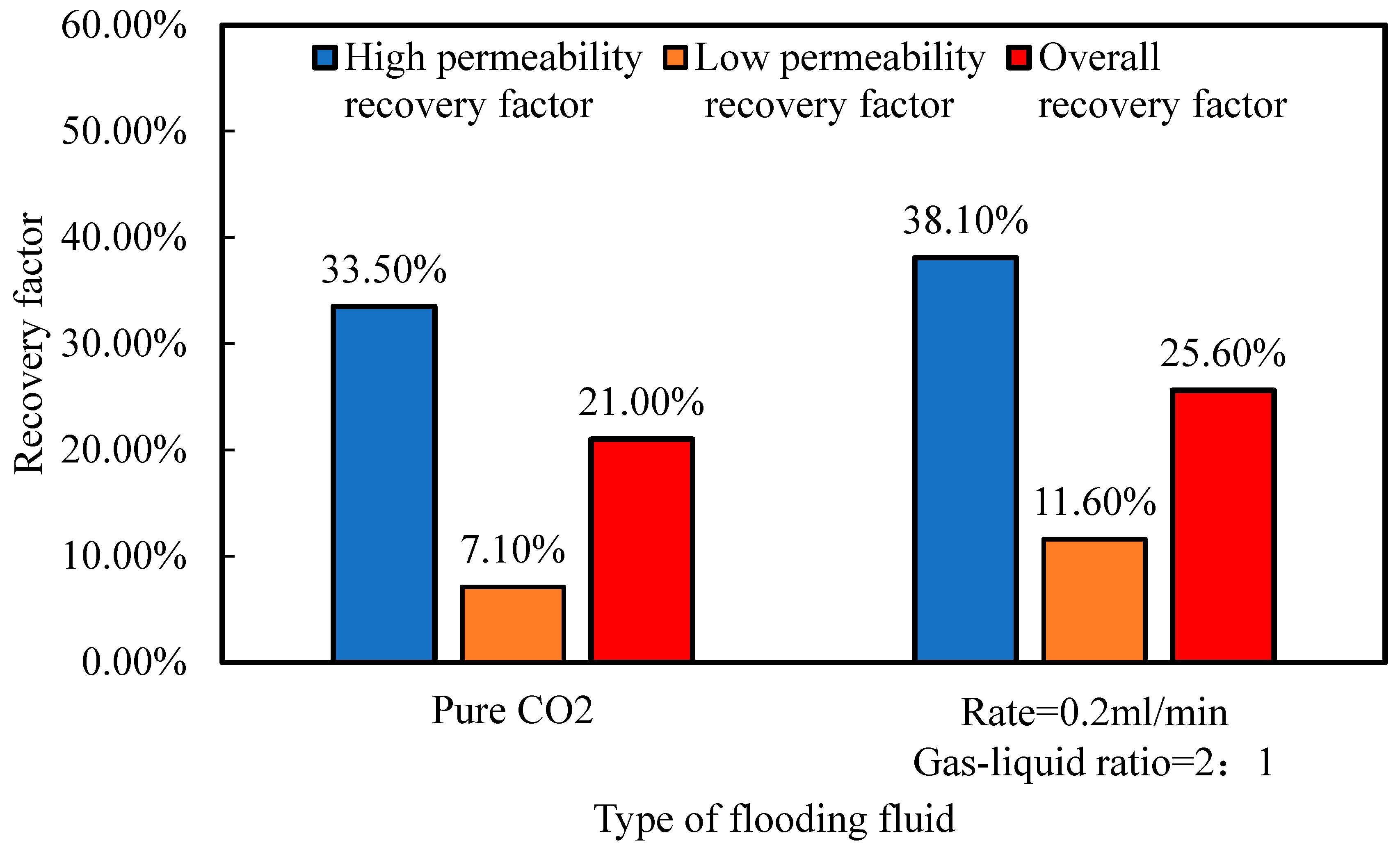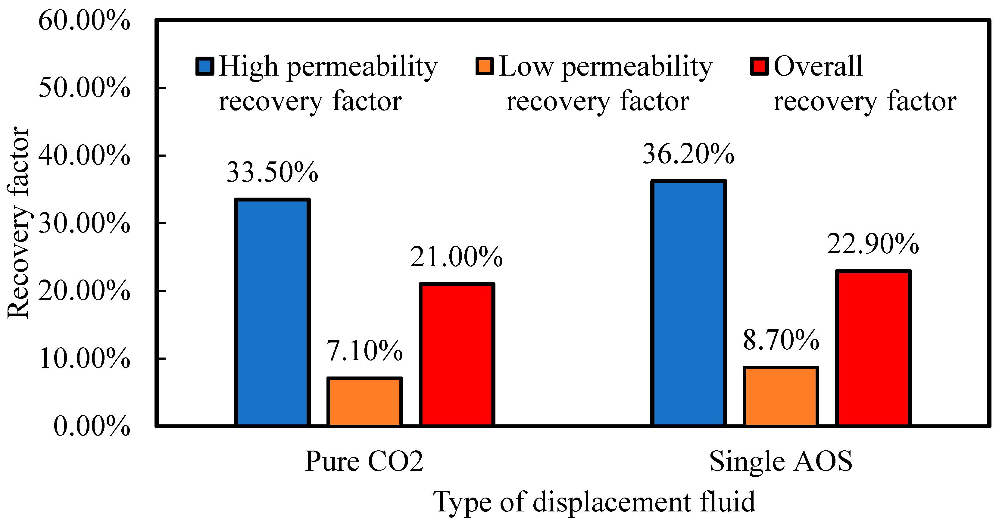 - The compound foam system significantly increased the overall oil recovery versus pure CO2 flooding, particularly in low-permeability zones, whose effect is better than that of the AOS single system as well.