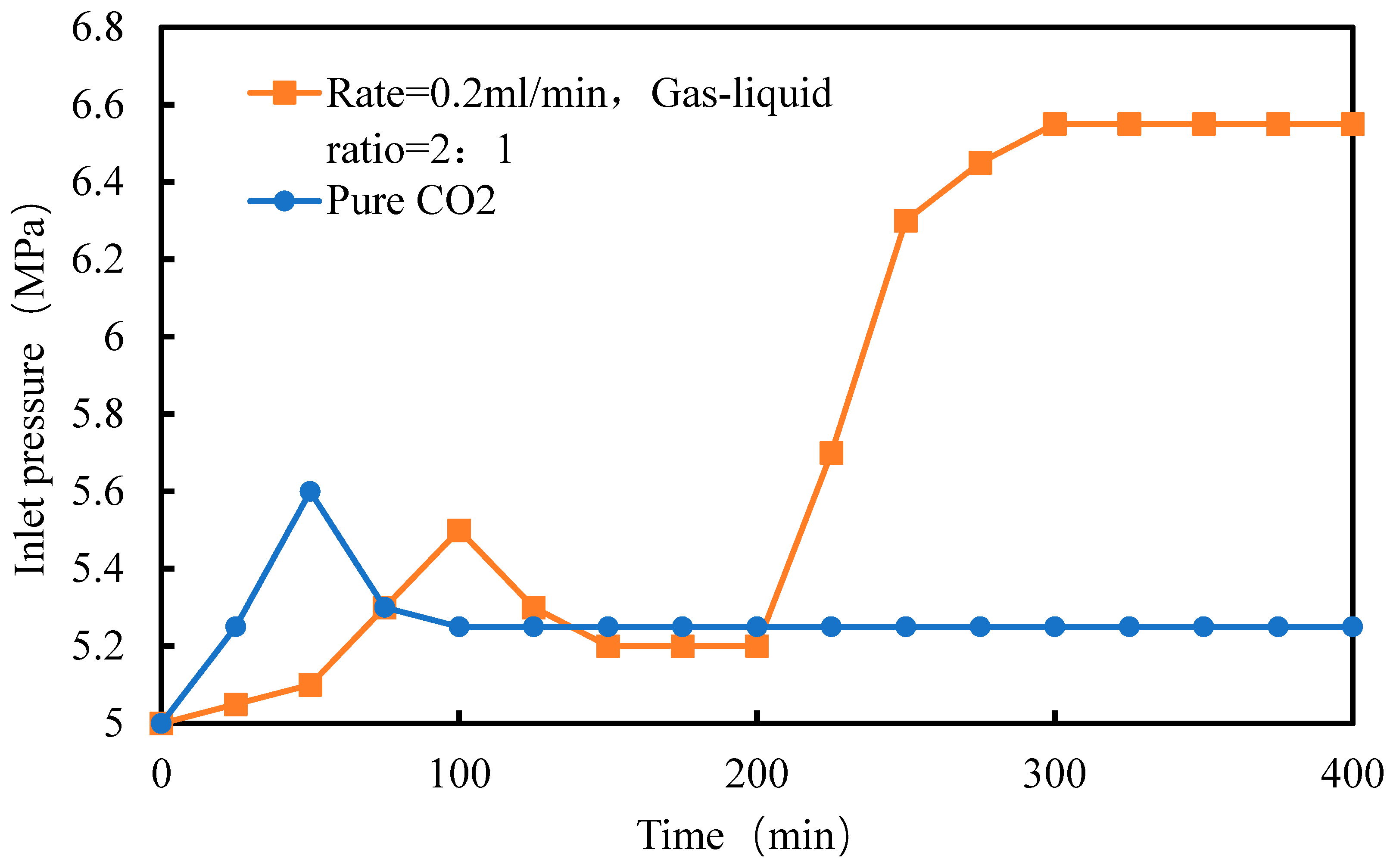 - Primary CO2 flooding: Open the valves connecting the CO2 container to the system and inject CO2 at a rate of 0.2 mL/min. Monitor the injection volume after CO2 breakthrough. Stop the flooding after injecting 4 PV, record the inlet–outlet pressure differential, and remove the cores for NMR T2 measurement;