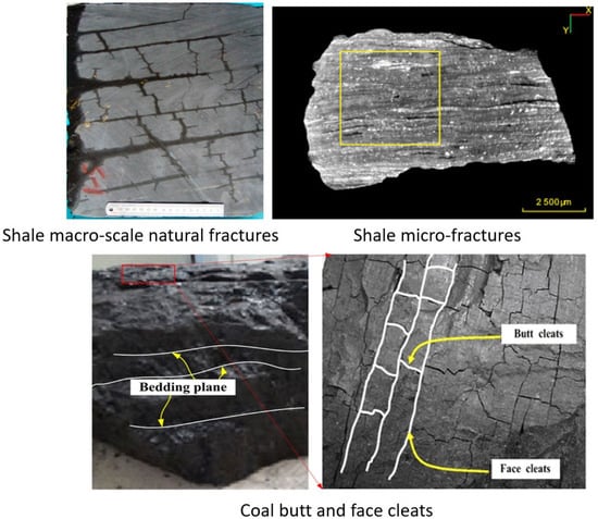 Rocks are generally anisotropic with their properties varying spatially and orientationally [,]. These properties, such as moduli, deformability, permeability, and the poromechanical responses of these rocks are frequently anisotropic [,]. It is widely reported that the permeability of coal and shale exhibits anisotropy to one extent or another [,,]. In the literature, the permeability of these rocks is usually treated as isotropic, particularly in horizontal directions []. However, as illustrated in Figure 1, multi-scale fracture networks are well developed in structurally anisotropic shale and coal rocks. Their anisotropic nature and complex poromechanical behavior make it difficult to precisely describe the permeability evolution.