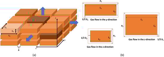 Conceptual geometry: (a) schematic of an anisotropic rock with different box-shaped matrix types (different colors represent matrices composed of different materials) and (b) schematic of effective flow channels and cross-sectional areas for gas flow in each direction.