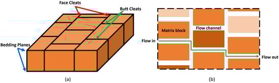 The coal and shale rocks are treated as a combination of matrix–block and fracture systems. In our conceptual model (Figure 2a), the effective pore space for gas flow is in the form of connected macro- or micro-fractures. The rocks consist of rectangular parallelepipeds and are orthotropic in their mechanical and swelling bulk properties. Similar to Reiss [], it is assumed that both the flow channel aperture and the dimensions of the matrix block can be different. Here, , , and are the dimentions of the box-shaped block (m); , , and are the flow channel spacing in the three directions (m); and , , and are the corresponding flow channel aperture values (m), as shown in Figure 2b. The numbers 1, 2, and 3 represent x-, y-, and z-directions. In fact, because , it is assumed that in each direction. As illustrated in Figure 3, the tortuosity also exhibits anisotropy and is not identical in different directions.