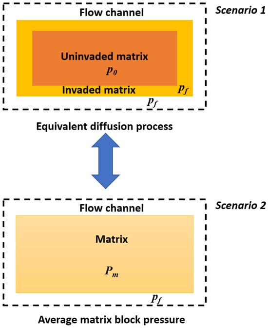 The gradual gas invading/depletion process from the fracture walls into the matrix during gas injection/extraction induces the transition from localized swelling/shrinkage at fracture surfaces to the bulk rock swelling/shrinkage (see Figure 4). The matrix swelling/shrinkage near the fracture surface is called local swelling, while the swelling/shrinkage of the whole rock refers to bulk swelling. The transition process between the two types of swelling/shrinkage generates matrix–fracture interactions. During gas injection or pressure depletion, the matrix block volume involves two parts: one is the gas invaded/depleted volume, and the other is the uninvaded/depleted volume under the initial condition. An invaded/depleted volume ratio is used to quantify how matrix swelling/shrinkage area expansion affects permeability evolution. It is the ratio of the gas invaded/depleted matrix volume to the total matrix volume, ranging from zero to one []. When the ratio is small, adsorption-induced matrix swelling is localized at the fracture surfaces and reduces the flow channel aperture. When the ratio increases, the whole rock swells, and localized swelling is transformed into bulk swelling, which enlarges both flow channel aperture and matrix block size. Since the matrix of coal and shale is usually extremely tight, this swelling transition procedure may last for a long time and would influence the long-term permeability evolution []. This ratio is used to characterize the magnitude of local and bulk swelling/shrinkage. In this study, a general pressure-dependent volume ratio is used. Two equivalent scenarios are used to represent matrix pressure and calculate the invaded/depleted volume ratio, as illustrated in Figure 4. Scenario 1 is the equivalent diffusion; it is similar to the previous study []. The gas invaded/depleted zone pressure is equal to the fracture (pore) pressure (), and the uninvaded/undepleted area pressure is equal to the initial pressure (). Scenario 2 shows the average pressure () of the matrix block during gas invading/depletion. By using the volume-weighted average method, the following relations can be obtained: