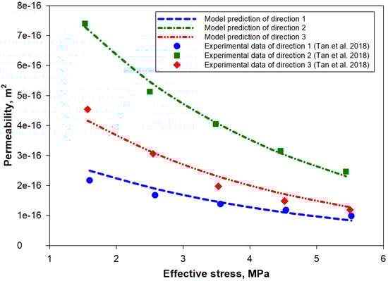 Substituting Equations (46)–(51) into Equations (43)–(45) yields the directional permeability models. Since the initial pressure and effective stress conditions for the three directional permeability measurement procedures are almost the same [], the same initial flow channel spacing and aperture values are used in the three simulation cases. For the test in direction 1, the pore pressure was fixed at 1.55 MPa, and the confining pressure increased from 3.15 to 7.07 MPa. As for direction 2, the pore pressure was about 1.13 MPa with the confining pressure changed from 2.66 to 6.58 MPa. In the vertical-direction measurement, the pore pressure was around 1.08 MPa, while the confining pressure was within the range of 2.65 to 6.58 MPa. All the input parameters are selected from the literature and strictly determined through experimental data matching, as shown in Table 1. Figure 5 shows a good agreement between model prediction and experimental results. With the effective stress increases, the permeability in different directions drops in their own ways. The vertical permeability is higher than that in direction 1 because interconnected cleats are better developed in the vertical direction, which is evidenced by CT scanning []. Detailed explanation of experimental data has been given by Tan et al. []. The errors between calculation results and measured permeability are 4.25–15.6%, 1.29–6.58%, and 1.27–15.6% in directions 1, 2, and 3, respectively.