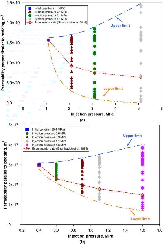 After checking the ability of handling anisotropic permeability evolution under constant average pore pressure conditions, the reliability of the invaded/depleted volume ratio is investigated. Experimental data matching is performed under constant confining pressure conditions. The two shale samples were collected from the same well at the same depth []. Their orientations with respect to bedding are perpendicular and parallel, respectively. Since only the permeability data in one horizontal direction are available, it is assumed that the permeability in direction 1 represents the permeability parallel to bedding. Methane is injected as the flowing fluid. Table 2 shows the permeability measurement data. The confining pressure of the two cases is fixed at around 30 MPa, while the pore pressure gradually increases. The effective porosity for gas flow can be significantly lower than the measured porosity because only flow channel porosity contributes to gas flow in our conceptual model []. The validation is presented in the form of permeability maps. The input parameters for simulation are listed in Table 3. The permeability maps of the two directions are shown in Figure 6a,b. Each vertical bar provides the range of permeability under a certain injection pressure level []. Each measured permeability value is only one point within the range. The upper and lower limits envelope the measured permeability curves. The upper boundary represents the final equilibrium permeability, and the lower boundary describes the permeability with maximum local swelling []. The values in between are all possible permeability points during a measurement procedure under a fixed injection condition []. Even the magnitudes of permeability in the two directions are dramatically different, the two permeability maps generated by this general anisotropic permeability model explain the experimental observations.